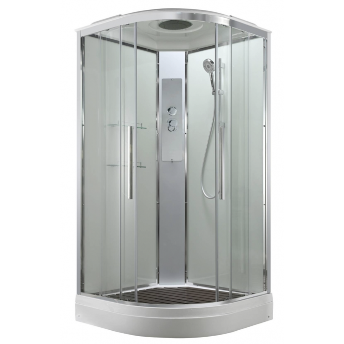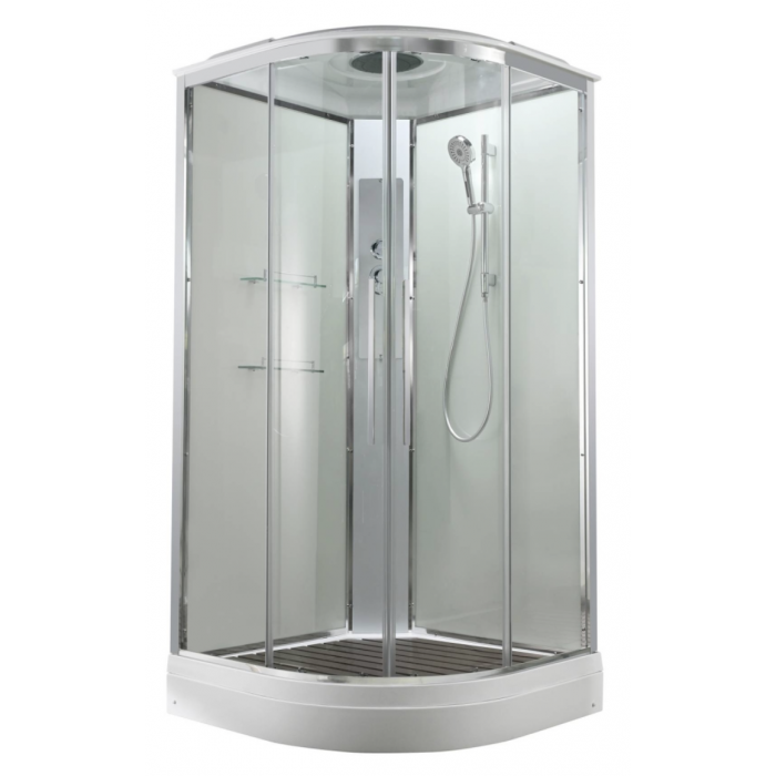 | Оснащение | душевой гарнитур, смеситель, полки, сифон, деревянная вставка в поддон, арома-лейка с витамином С |