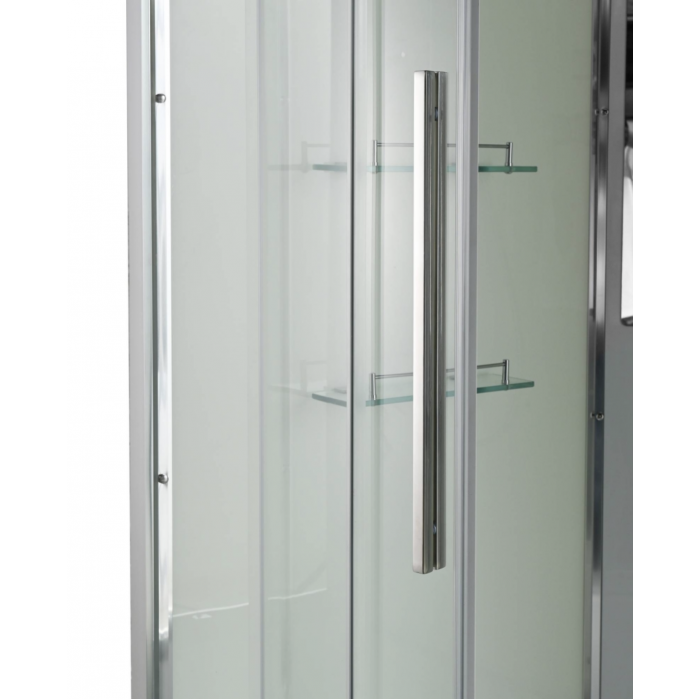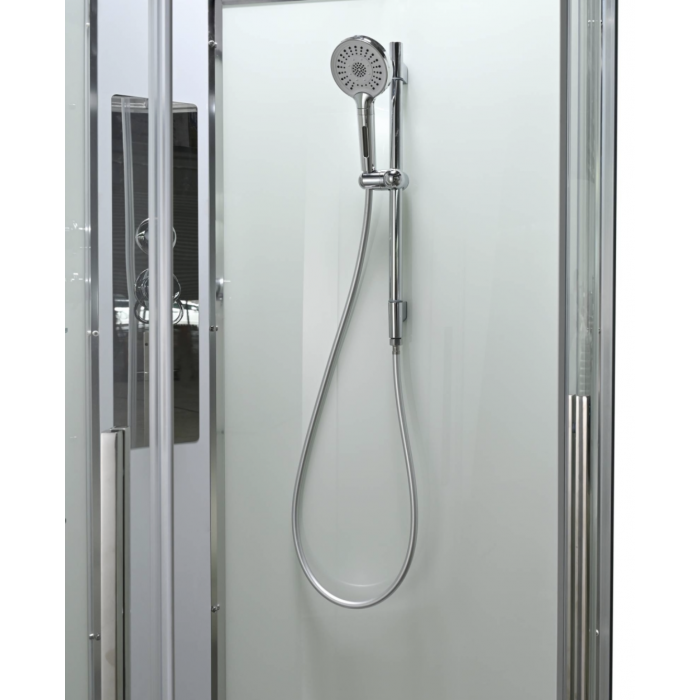 Оснащение | душевой гарнитур, смеситель, полки, сифон, деревянная вставка в поддон, арома-лейка с витамином С |