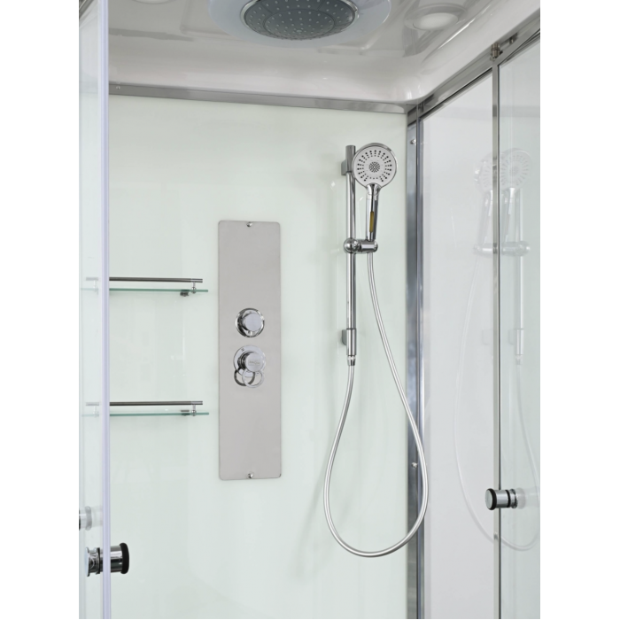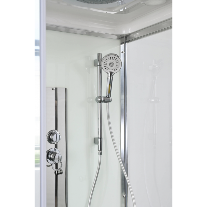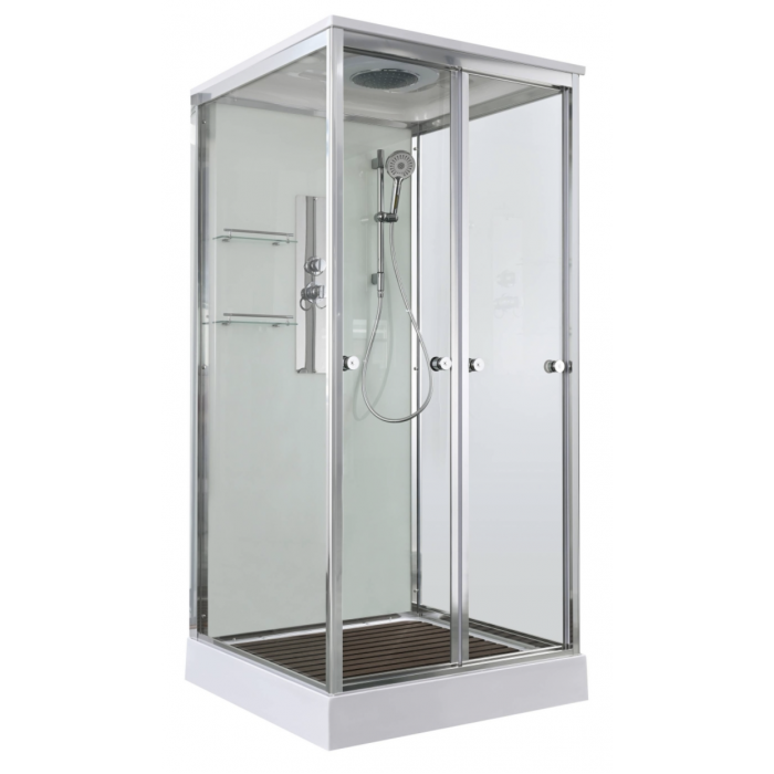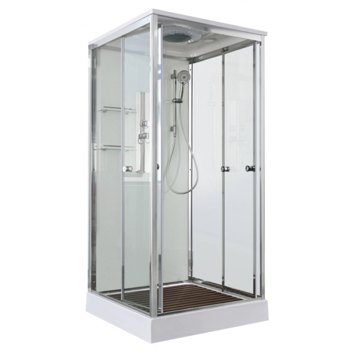 | Оснащение | душевой гарнитур, полки, сифон, деревянная вставка в поддон, арома-лейка с витамином С |