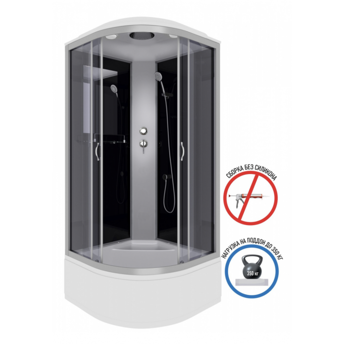 | Оснащение | душевой гарнитур, полки, сифон, экран |