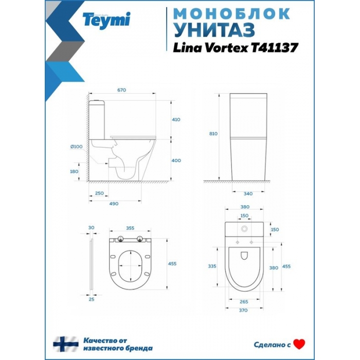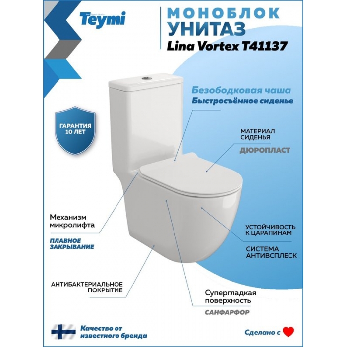 Мы предлагаем широкий ассортимент сантехники для дома и офиса. Унитаз-моноблок Teymi Lina T41137 слив торнадо купить со скидкой в нашем интернет-магазине Vanna-Store.ru и забрать самовывозом в Москве.