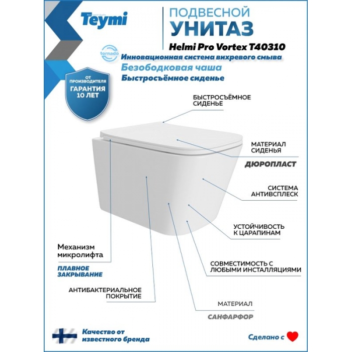 Мы предлагаем широкий ассортимент сантехники для дома и офиса. Унитаз подвесной Teymi Helmi Vortex T40310 безободковый купить со скидкой в нашем интернет-магазине Vanna-Store.ru и забрать самовывозом в Москве.