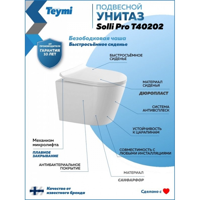 Унитаз подвесной Teymi Solli Pro T40202 безободковый купить с доставкой по Москве и Подмосковью.